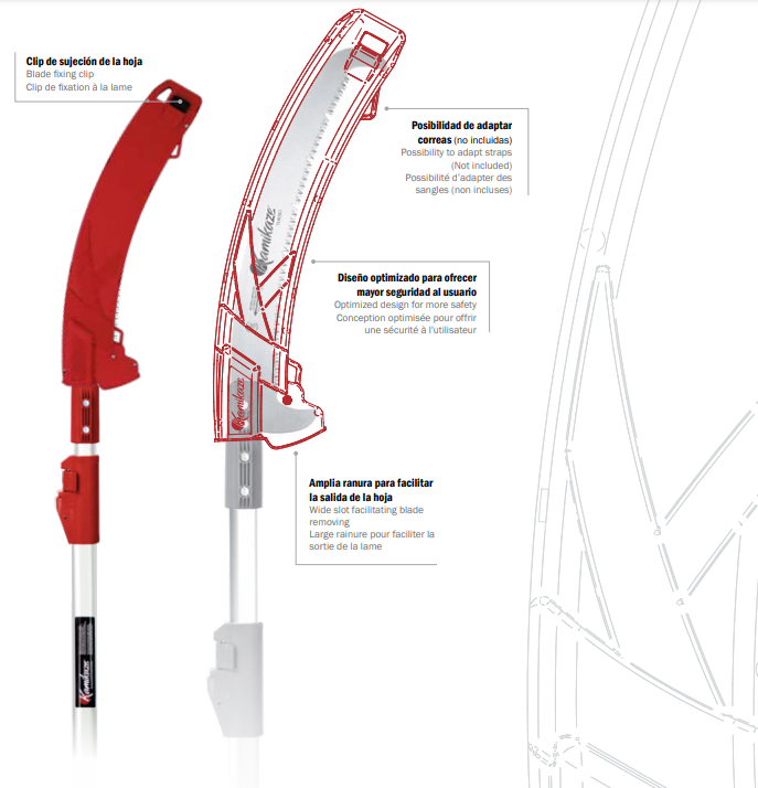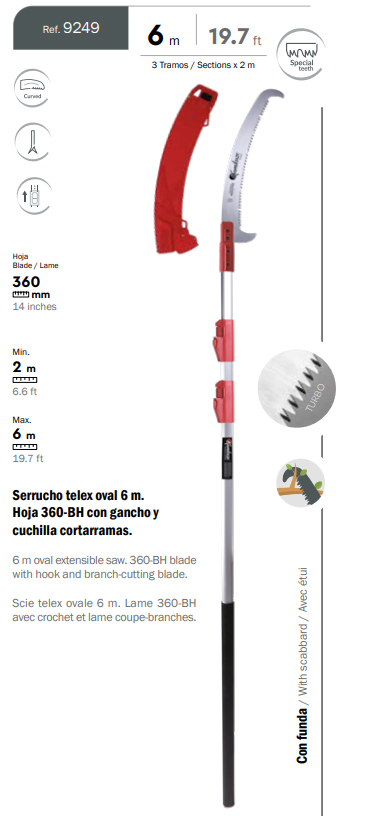 This version of the 360-BH long-reach saw comprises three 2 metre sections, with the smaller diameter shaft having four holes which facilitate adjustment to different lengths. The oval aluminium shaft is internally reinforced in the locking button area and optimises the ratio between weight, mechanical strength and rigidity.