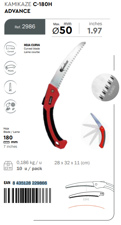 The Kamikaze C-180H foldable hand saw, with its curved blade and plastic, non-slip rubber grip handle, makes pruning work extremely comfortable, even without wearing gloves.