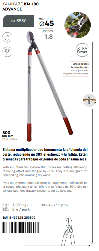 With an overall length of 80cm, the Kamikaze KM-180 Advance lopper weighs just 1.289kg and is suitable for professional use.