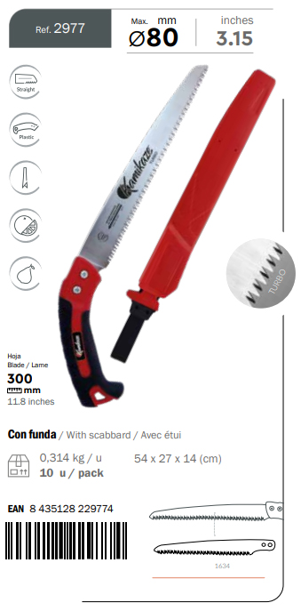 The professional Kamikaze S-300H straight blade saw, with its rubber-coated plastic handle, makes intensive pruning work extremely comfortable, even without wearing gloves. The special curved design of the handle reduces the effort required for cutting so it is easier to prune hardwood.