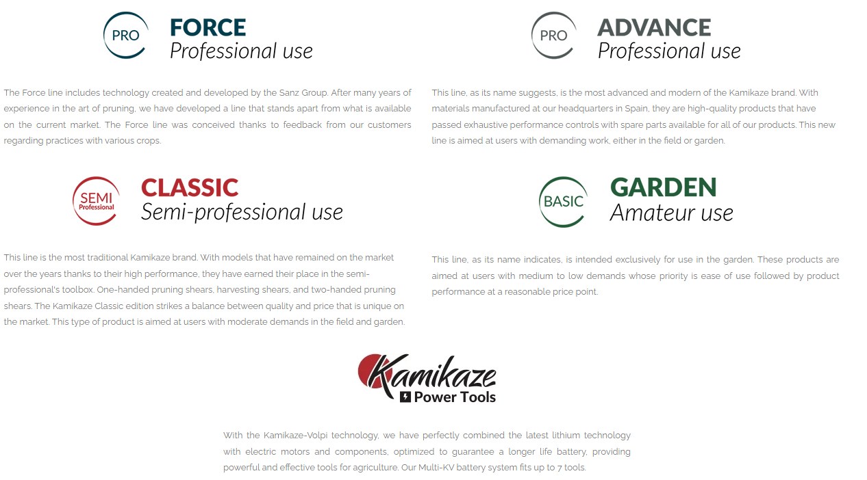 Kamikaze is the brand that specialises in pruning, harvesting and agricultural tools. Created in 2000, Kamikaze has earnt itself a place in the market thanks to its wide range of products, excellent value for money and being one of the leaders to introduce Japanese blades into Europe.