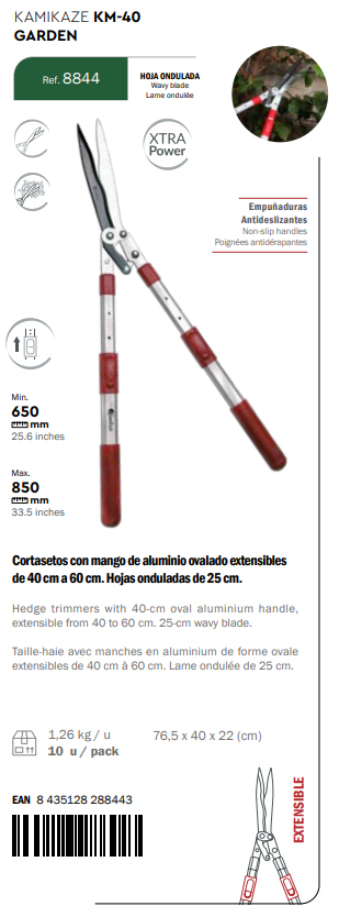 Designed for domestic use, the Kamikaze Garden KM-40 is the ideal hand tool for trimming and shaping high and low hedges and shrubs in the garden.