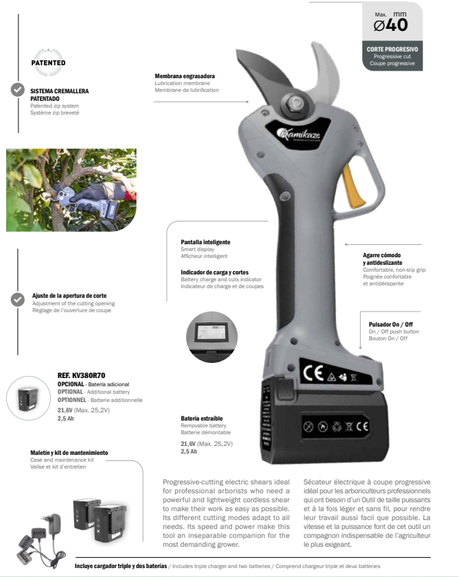 The secateurs are equipped with a smart display that not only shows the battery charge level, but also provides information about the cuts made. Lightweight and easy to handle, the Kamikaze KV 390 weighs only 1.2kg and features an ergonomic, non-slip grip.