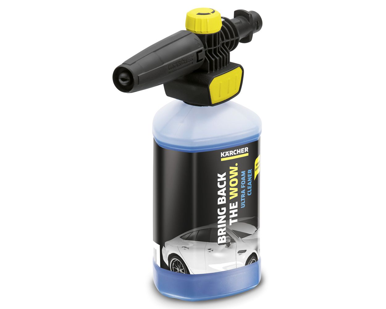 FJ 10 C Connect 'n' Clean foam nozzle with ultra foam cleaner. The quick-change system for applying detergent allows rapid switching between different detergents with a single click. The detergent dose can easily be adjusted on the foam nozzle (yellow knob). The jet level can be adjusted as required.