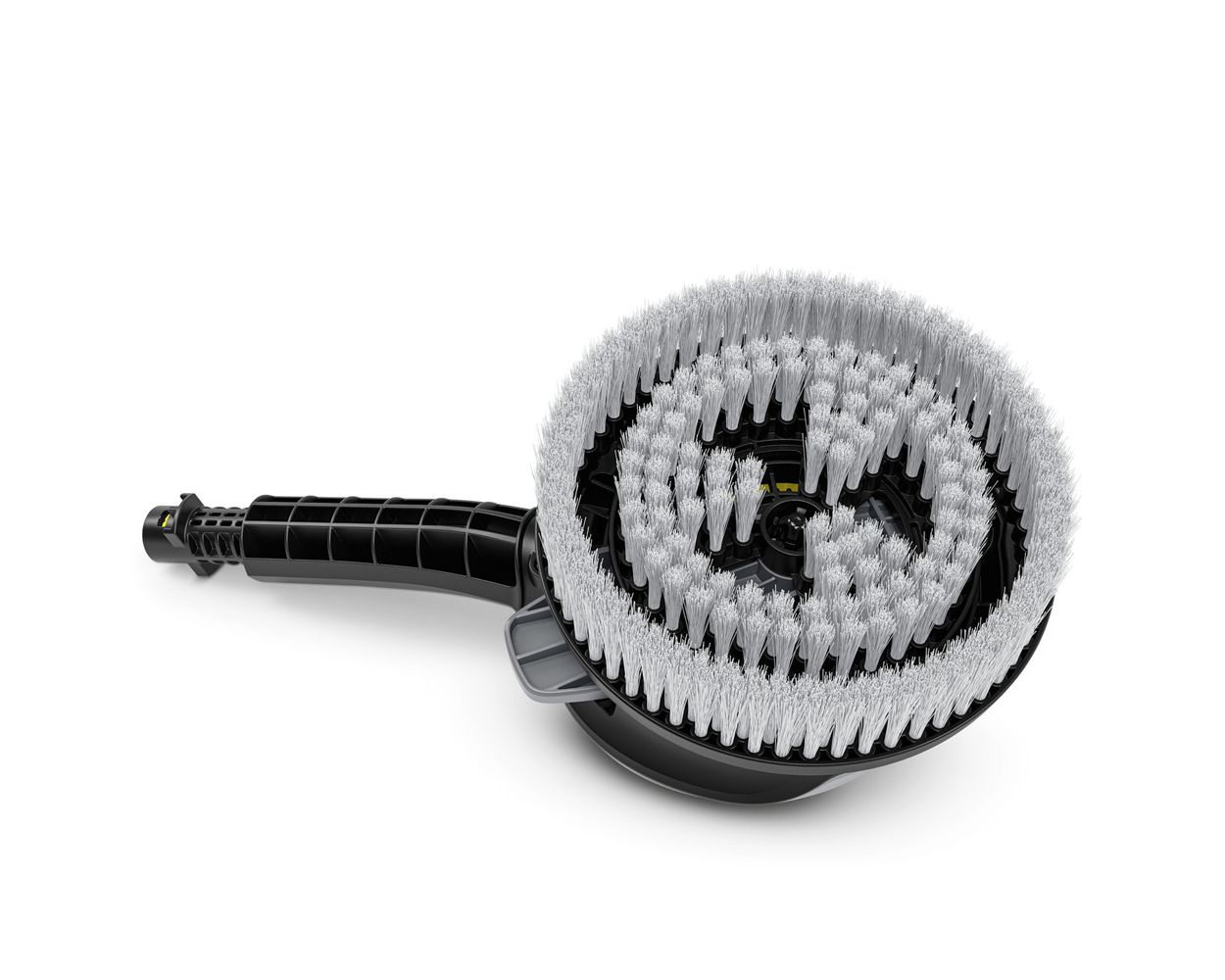 The Kärcher rotating wash brush including the interchangeable attachment Universal is equipped with a release lever for quick and easy attachment changing without contact with dirt, and also features a transparent cover for a particularly impressive cleaning experience. The pressure washer brush is recommended for thorough cleaning of a variety of surfaces such as paint, glass or plastic.