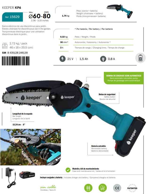 Safe and easy to use and with a cutting diameter of 60-80mm, the Keeper KP6 cordless chainsaw slices through even thick branches, stems and stalks like a knife through butter.