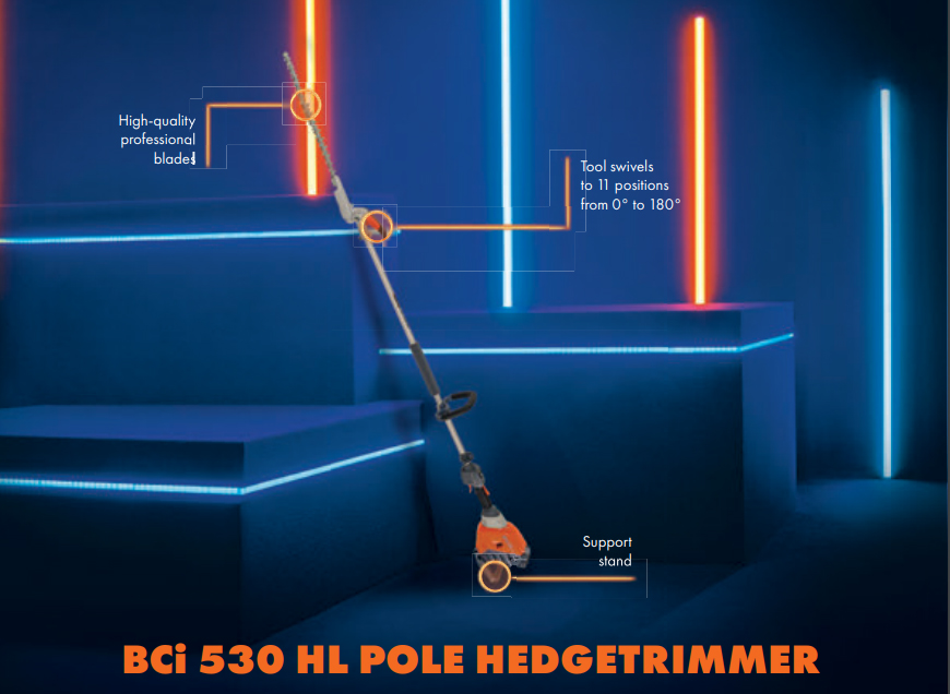 The selection of four different cutting speeds up to 4600 cuts per minute allows operation, with the right amount of energy, on both thin-leafed and substantial vegetation. The hedge cutter head articulates to 11 positions from 0° to 180° to guarantee maximum comfort while working for prolonged periods. The high-performance power unit, an exceptionally strong 55cm blade and low weight makes the Oleo-Mac BCi 530 HL well suited for the maintenance of public and private outdoor spaces, as well as for demanding homeowners.