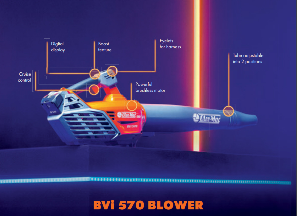 Offering power equivalent to a petrol model, with a much lighter weight, the Oleo-Mac BVi 570 hand-held blower is ideal for the clearing of large areas. Professionals can count on the 56V battery-powered leaf blower to deliver convenience, performance and all the technology needed to get the job done.