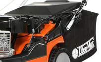 Grass collectorStrong and versatile 80 litre capacity plastic and fabric grass catcher, which can be assembled without tools, has full-bag indicator. Large collection bag means fewer stops to empty, with protective canvas top to prevent exposure of the operator to dust. Superior collection capacity assured by a wide discharge duct and aerodynamically contoured interior of deck. |
