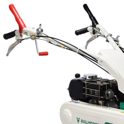 The operator is protected from flying debris by the Bull mower's steel flap guards which help keep dangerous objects inside the cutter deck. The handle can be adjusted vertically and horizontally with one lever.