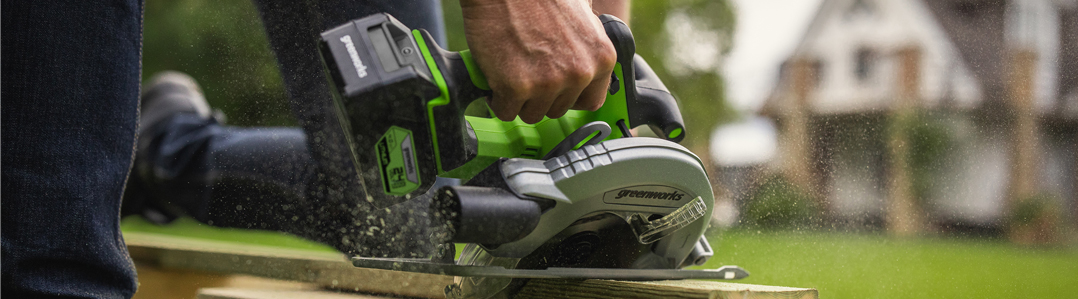 The GreenWorks GD24CS is a powerful, lightweight 24V circular saw designed for home DIY. Powered by an advanced 24V lithium-ion battery, the tool offers high cutting performance despite its compact size.
