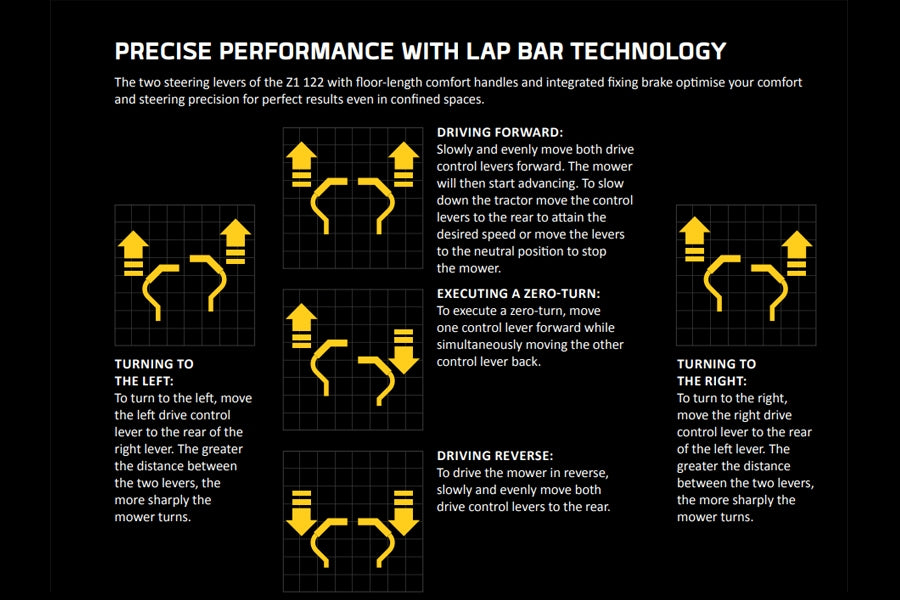 Turning to the right:To turn to the right, move the right drive control lever to the rear of the left lever. The greater the distance between the two levers, the more sharply the mower turns. |