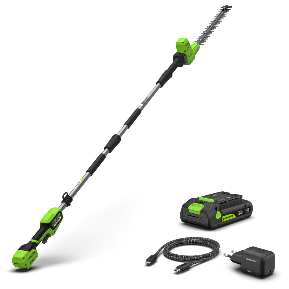 GreenWorks PH24B211-01 24V Long Reach Cordless Hedge Trimmer (with 2Ah HP Battery & 65W Charging Block with USB)