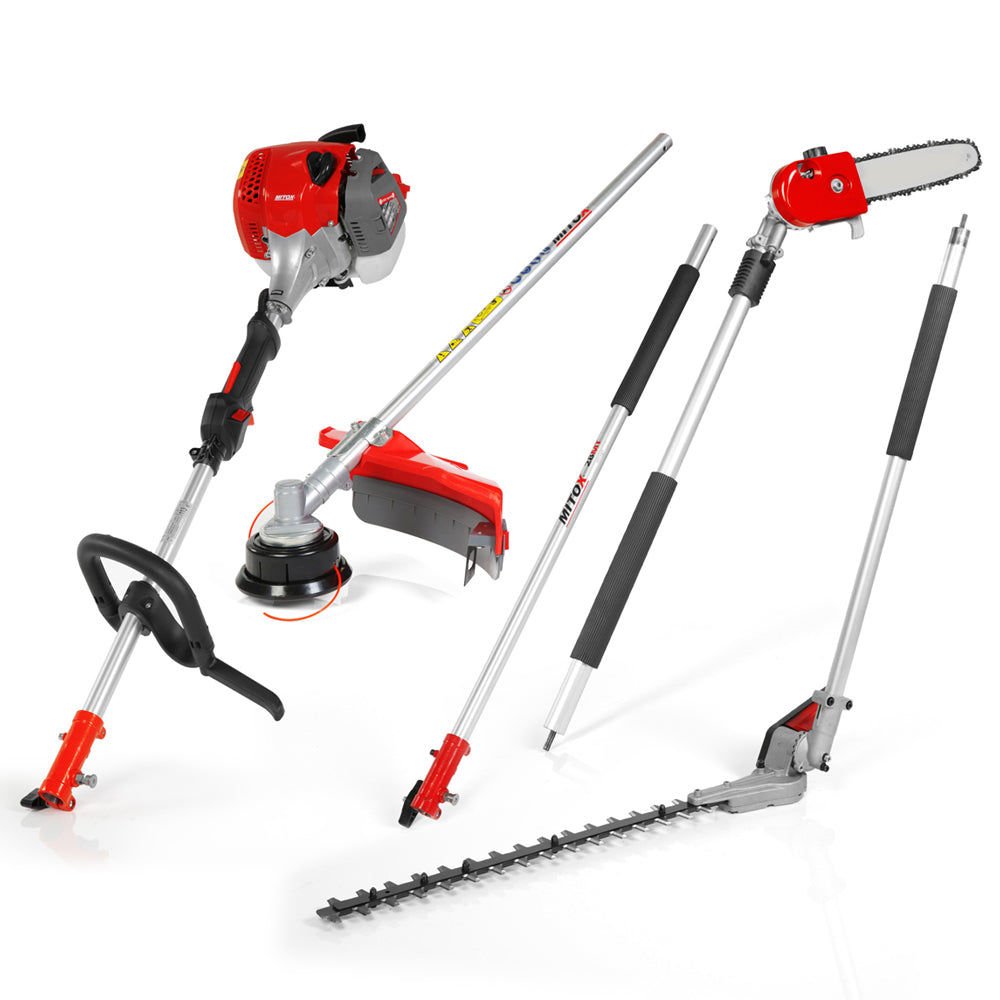 The Mitox range of petrol garden machinery consists of high quality grass trimmers, brush cutters, hand-held and long reach hedge trimmers, garden multi tools, pole pruners, chainsaws, log splitters and leaf blower/vacuums.