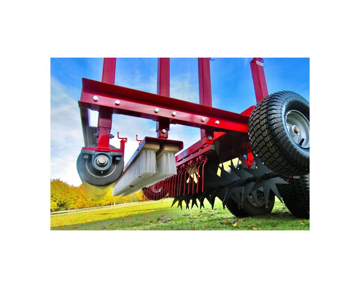 A single pass allows up to four operations to be carried out simultaneously. First, the leading star-shaped slitter bar pierces the surface to increase drainage and promote root growth. Followed by the brush and rake bars which tickle over the surface to enhance the quality and appearance of the area. Lastly, the rear roller firms up the surface and gives that much sought after striping. The four three tools can be adjusted by individual screw jacks for depth and pressure and can also be arranged in any order or lifted out when not required.