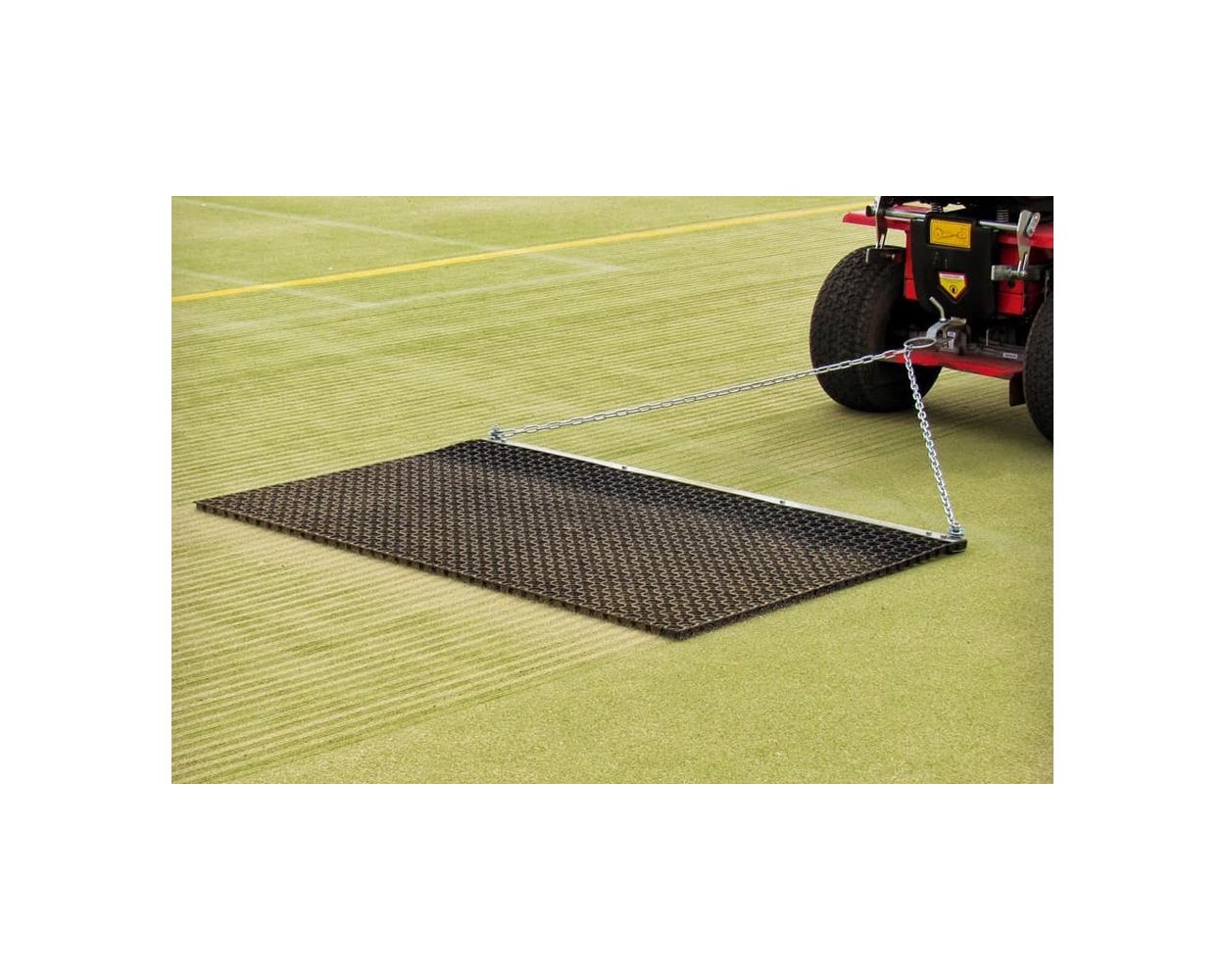 The SCH rubber drag mat is constructed from moulded rubber with a galvanised towing bar. It is ideal for use on most surfaces, both natural and artificial. The rubber matting lessens surface damage that may be caused by heavier metal units.