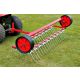 The two rows of heavy-duty spring tines dig into the surface pulling out dead grass. With the transport wheels removed and the unit turned over it becomes a very efficient levelling unit to tackle mole hills and level seed beds.