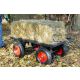 The trolleys run on four 400 x 8 pneumatic wheels with bearings. The turntable mechanism allows the front two wheels to turn, preventing the wheels from scuffing the grass when turning. The design of the handle allows the trolley to be pulled by hand or mechanically towed.