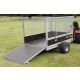 The trailer has a carrying capacity of 750kg, is supplied with fixed high mesh sides and is ideal for carrying animals or bulky loads such as straw, leaves, grass cuttings logs, etc. The wide 20 x 10-8 wheels give the trailer good flotation over unfriendly ground. A ramp tailgate is incorporated into the build. The ramp, floor and solid sides are constructed of a high quality phenol-ply.