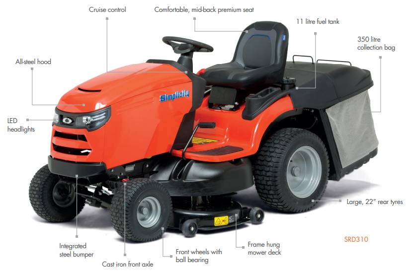 The Simplicity Regent RD RD310 rear collect tractor has a 42"/107cm twin-bladed, stamped steel cutting deck and a large 350 litre collector, which features a large comfortable lever enabling the user to empty the grass without leaving the seat.