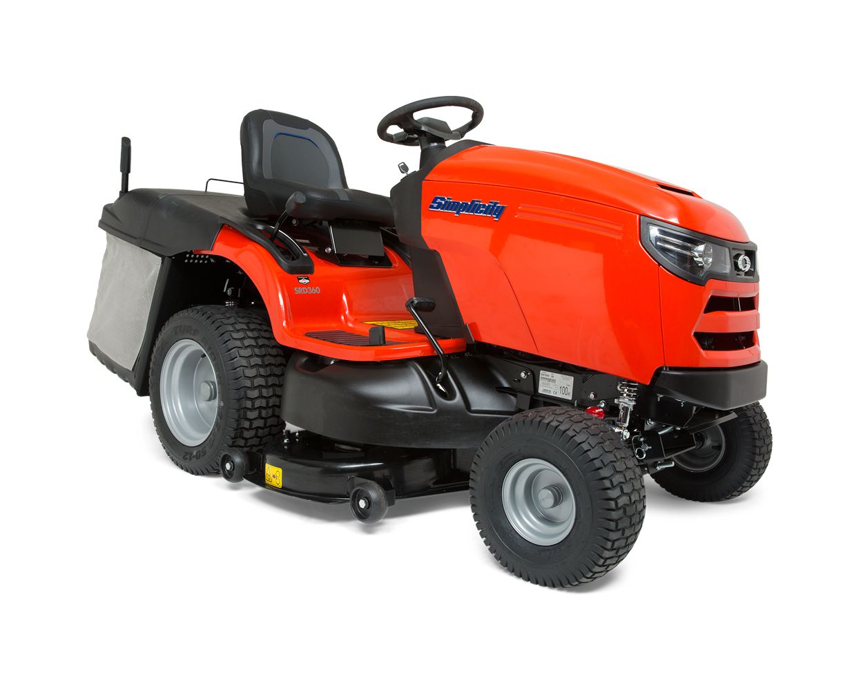 The Simplicity Regent RD SRD 360 rear collect tractor has a 42"/107 cm, twin-bladed, stamped steel cutting deck and a large 350-litre collector, which features a large comfortable lever enabling the user to empty the grass without leaving the seat.