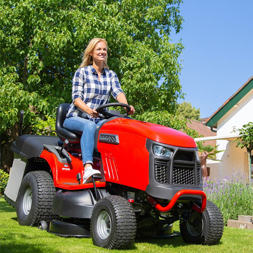 Manoeuvrability is enhanced thanks to the lawn tractor's tight 36cm turning circle whilst the pivoting cast-iron front axle and large 22" rear wheels allow a smoother ride over rougher terrain. The solid steel front bumper bar adds extra durability.