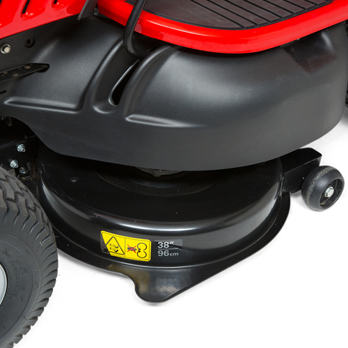 96cm rigid steel mower deck with wash portThe 96cm frame hung steel deck with two support wheels to protect the mower deck on uneven terrain. Easily clean the deck after mowing by connecting your garden hose with the wash port.