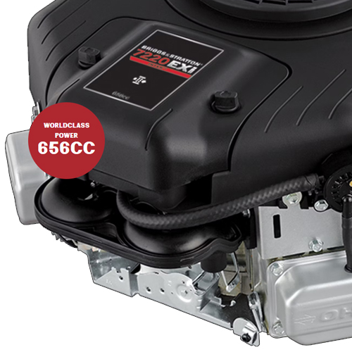 Beneath the steel bonnet lies a 656cc Briggs & Stratton 7220 EXi V-Twin cylinder OHV engine. Powerful and fuel-efficient, low vibration and smooth running are characteristics of this engine thanks to the V-Twin cylinder design. The engine features a full pressure lubrication system and spin-on oil filter to enhance maximum service life.
