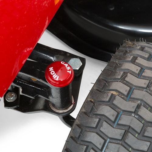 Cast-iron front axle for strength and superior steering controlThe cast-iron, pivoting front axle smoothly tracks over rough terrain for an even cut. |