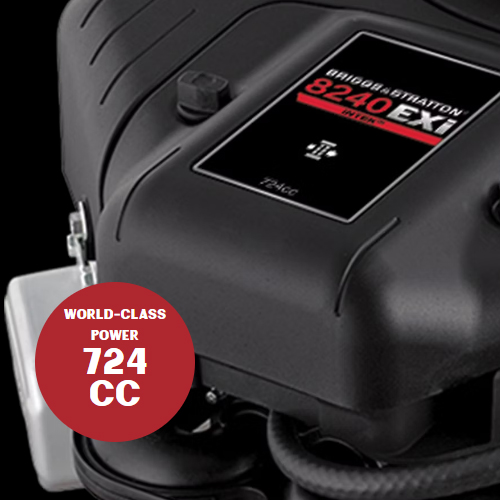 Power is provided by a 724cc Briggs & Stratton 8240 PXi engine. This premium V-Twin cylinder unit provides efficiency and smooth running and has features including a full pressure lubrication system and spin-on oil system to enhance maximum engine life.