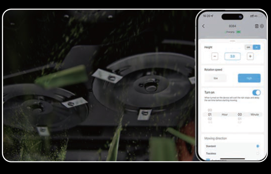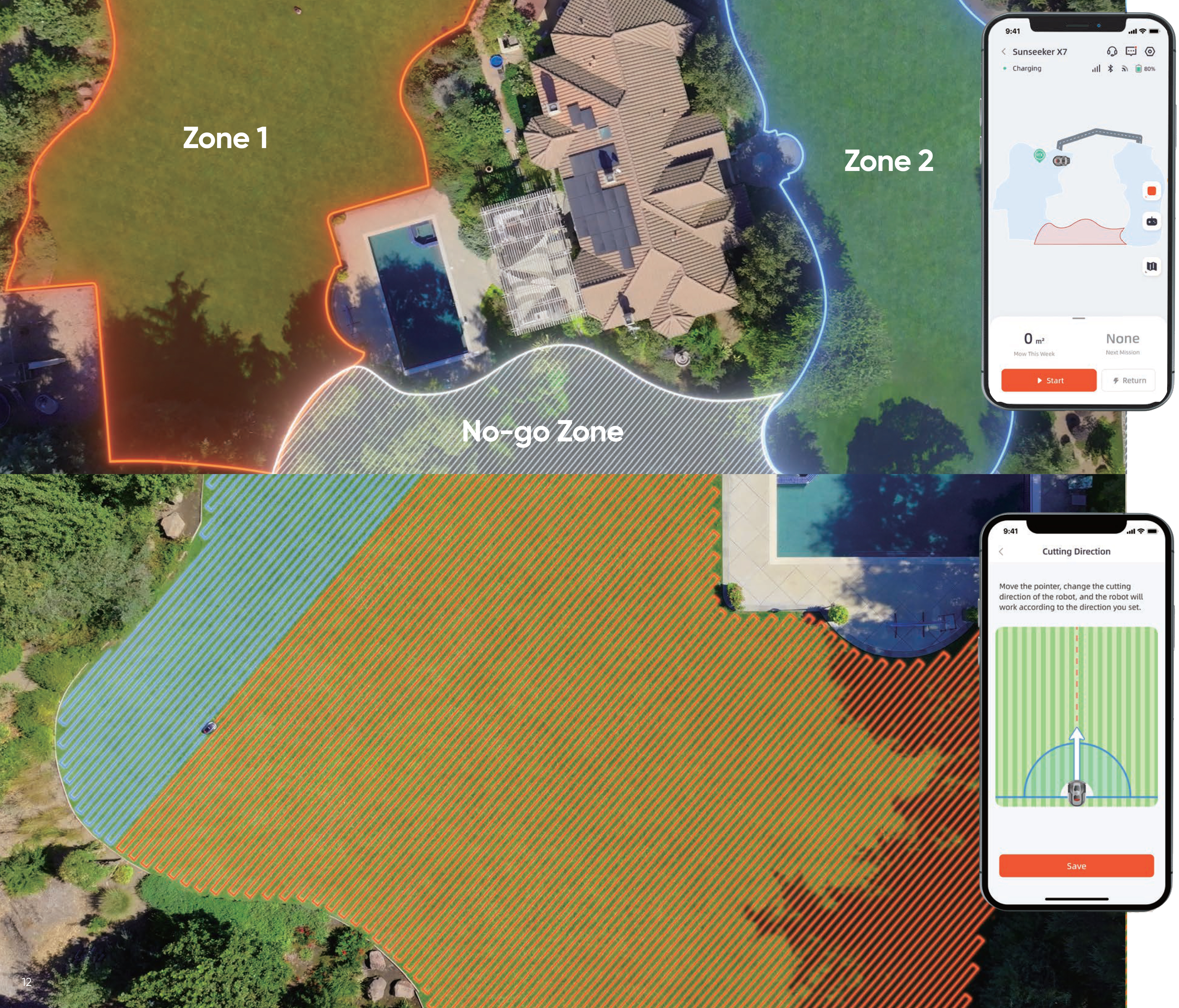 Multi-zone managementMultiple lawn areas are no longer a challenge. Following the normal boundar setting process, you can establish multiple cutting zones, add pathways between zones, and designate areas where mowing is not permitted. Through the app, you can easily customise cutting settings and work schedules for each zone according to lawn conditions.