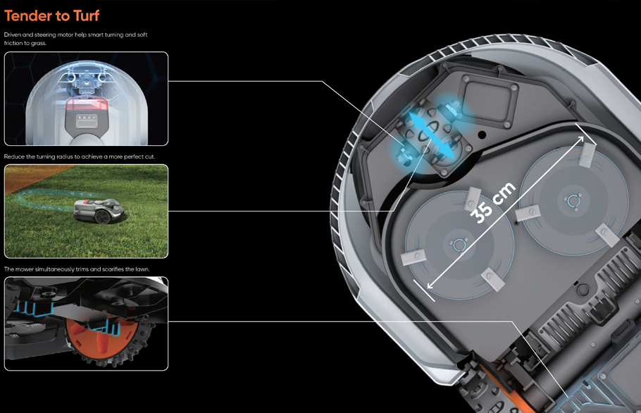 Steering motors tender to turfAdvanced steering motors enable smart, precise turns with minimal friction. Trim in one seemless step for a healthy, professional finish. |