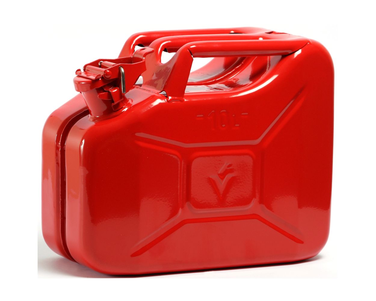 A heavy-duty steel red fuel can with 10 litre capacity suitable for all fuel types.