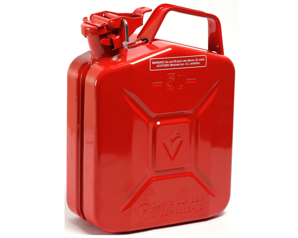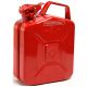 A heavy-duty steel red fuel can with five litre capacity suitable for all fuel types.