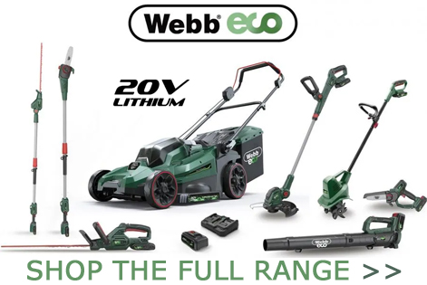 The Webb Eco range of garden machinery offers long-lasting, interchangeable advanced 20V lithium-ion technology for a more sustainable and verstatile gardening experience.