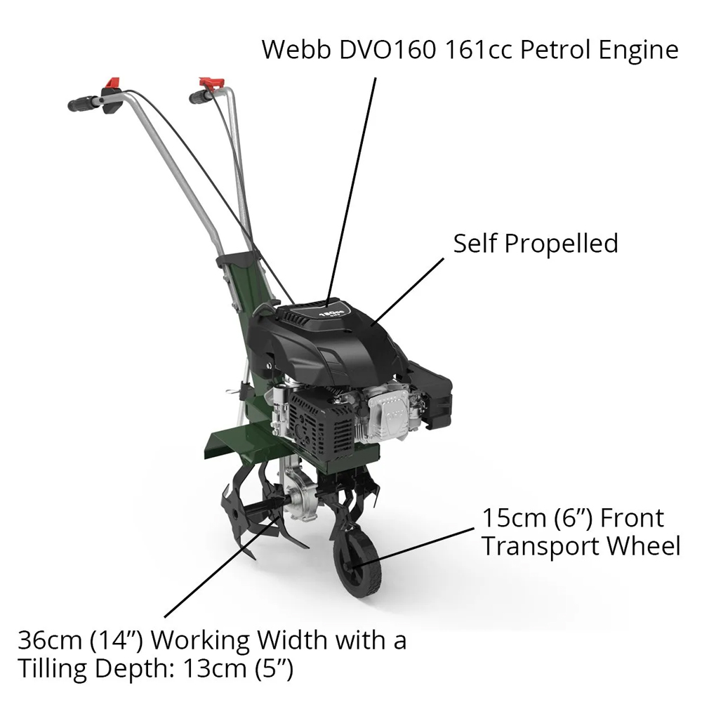 - EXCELLENT 36cm (14″) WORKING WIDTH – this high-performance powerful 161cc OHV engine tiller from Webb will help deliver excellent preparation for your vegetable garden. It has an adjustable depth skid and is fitted with a fixed handlebar and transport wheel, making it easy to store and manoeuvre.