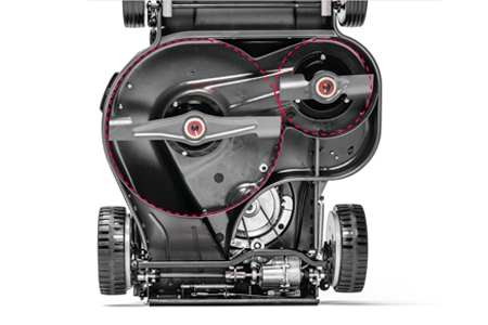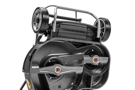 The overlap twin-blade deck design eliminates the need for a timing belt system, which must be maintained regularly and can be more costly to repair over time. As a professional lawn mower, every detail has been thought out; from the adjustable handles with user cockpit to the large durable grass collector with active airflow fabric to indicate when full, and the heavy-duty front bumper to protect and aid in transportation.