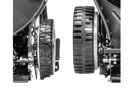 Wider wheelsDue to the additional weight of the mower, Weibang has increased the diameter and width of the front and rear wheels to ensure that the ground pressure is the same as a 53cm model, avoiding marks on the lawn. |